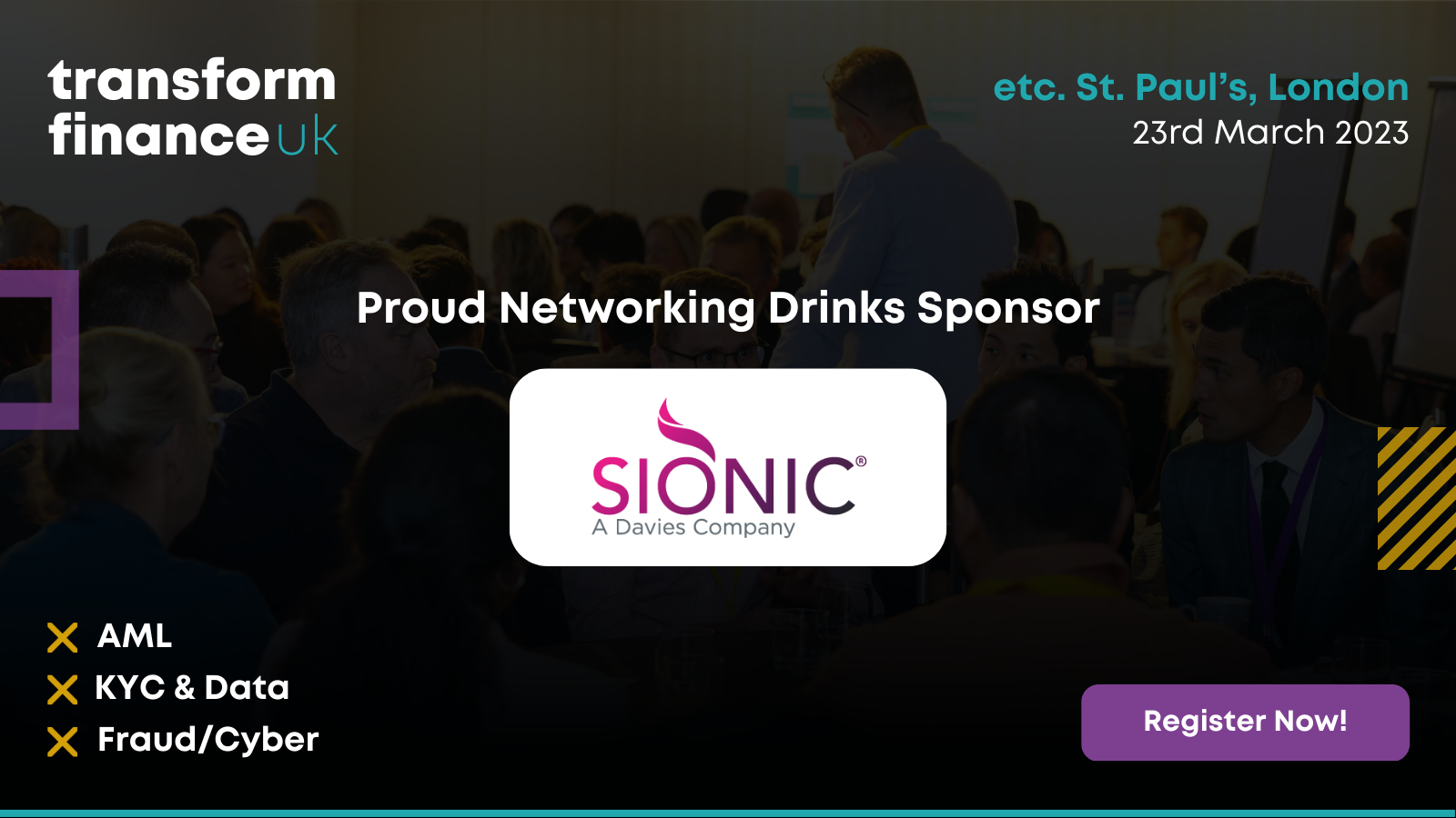 As experts in all aspects of financial crime and compliance, including AML and KYC, we are delighted to sponsor the networking drinks at Transform Finance UK 2023 in London.